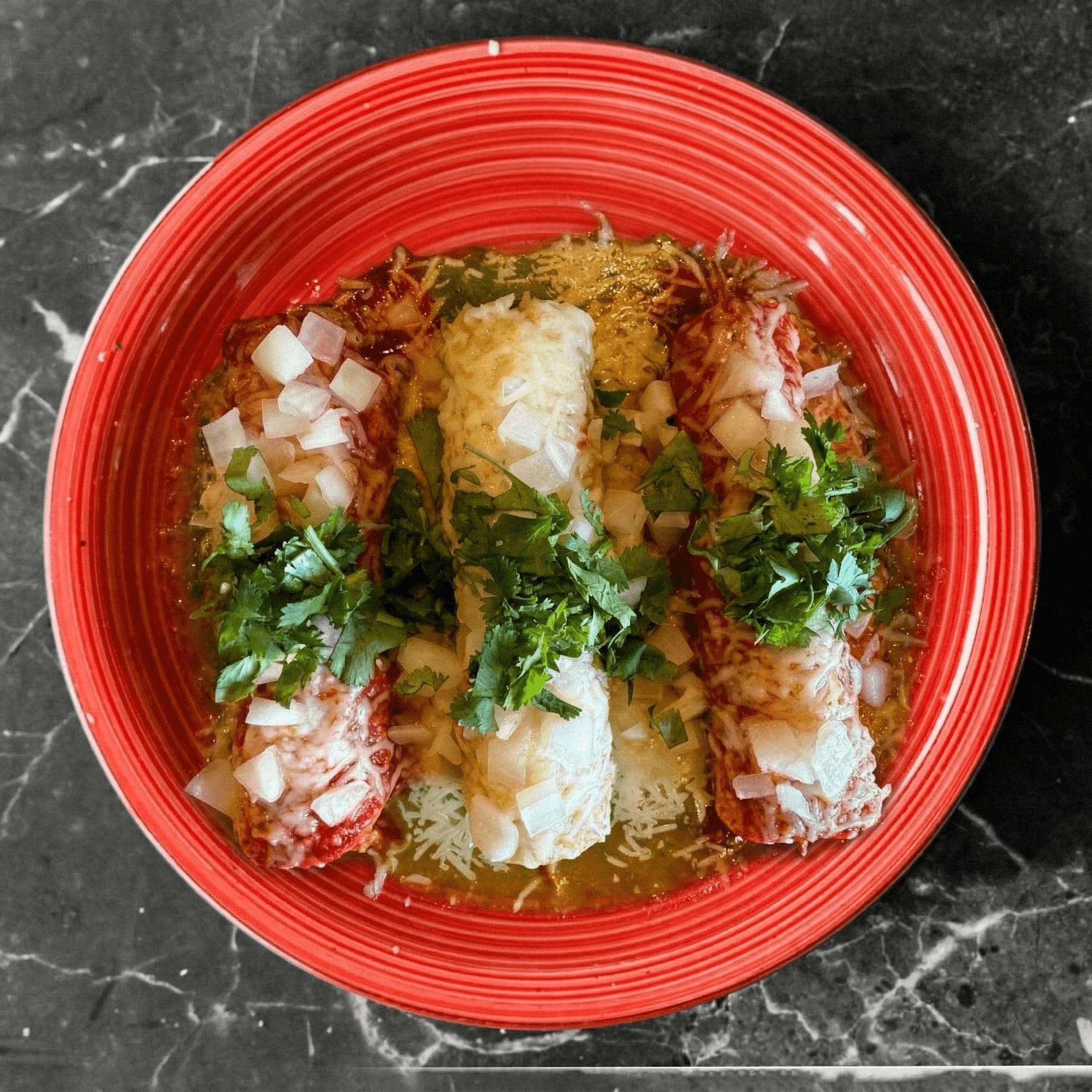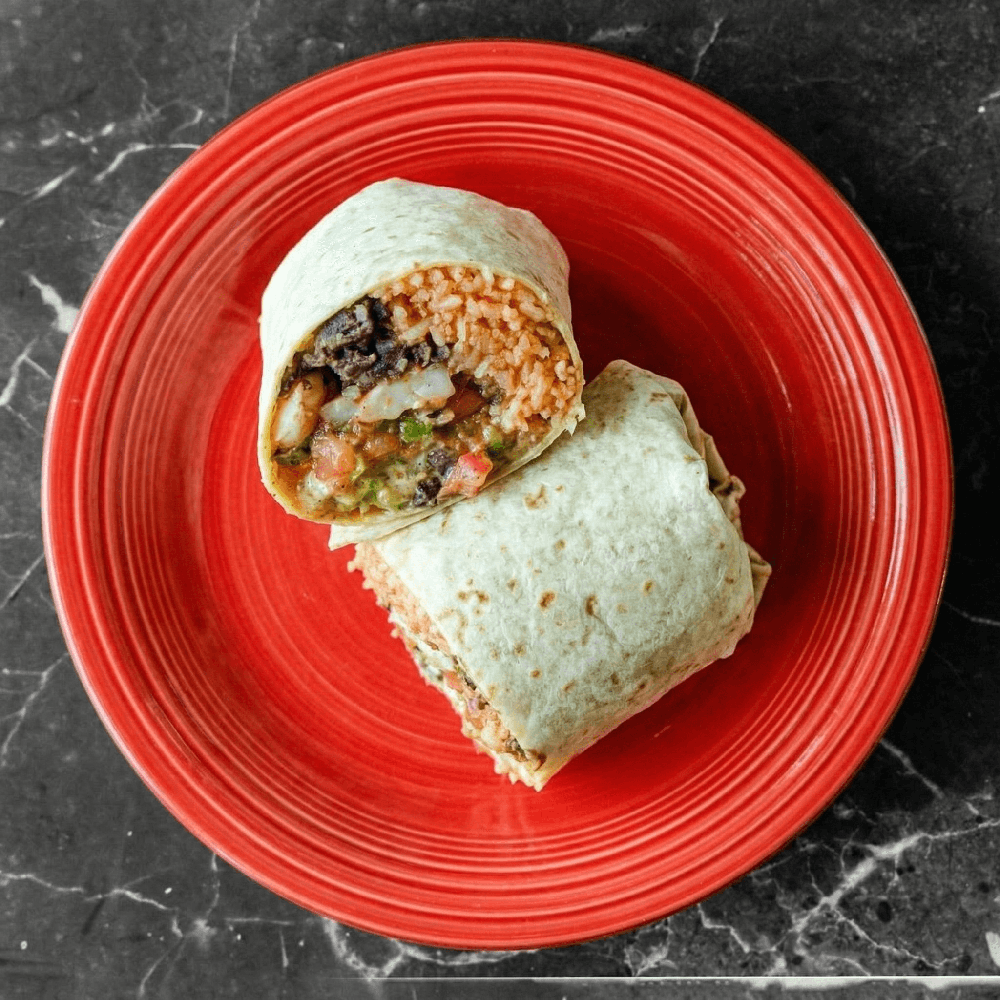 Choice of protein, grilled shrimp, grilled corn, avocado, choice of beans, rice, cilantro, onions, cheese, tomato, sour cream, serrano pesto, choice of sauce