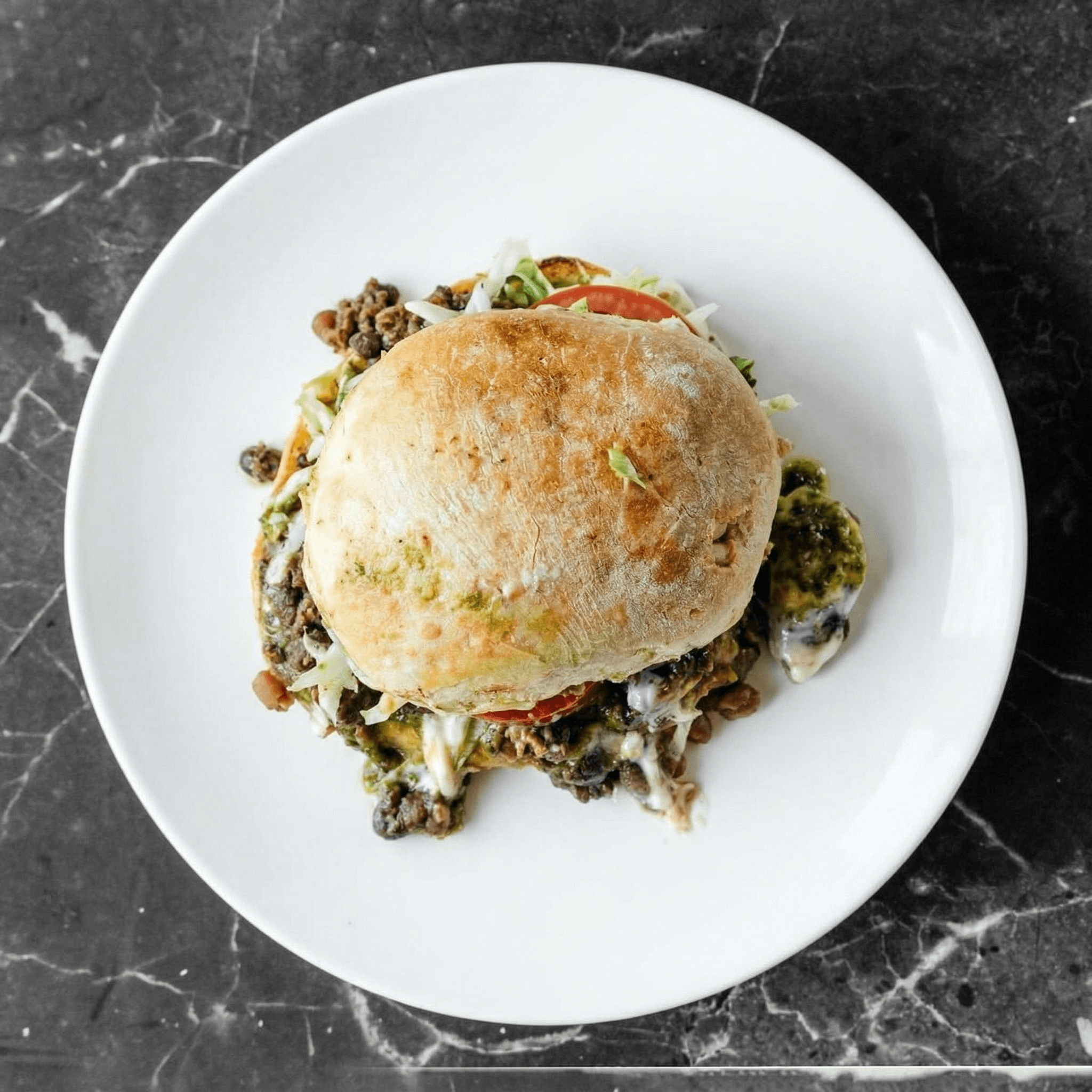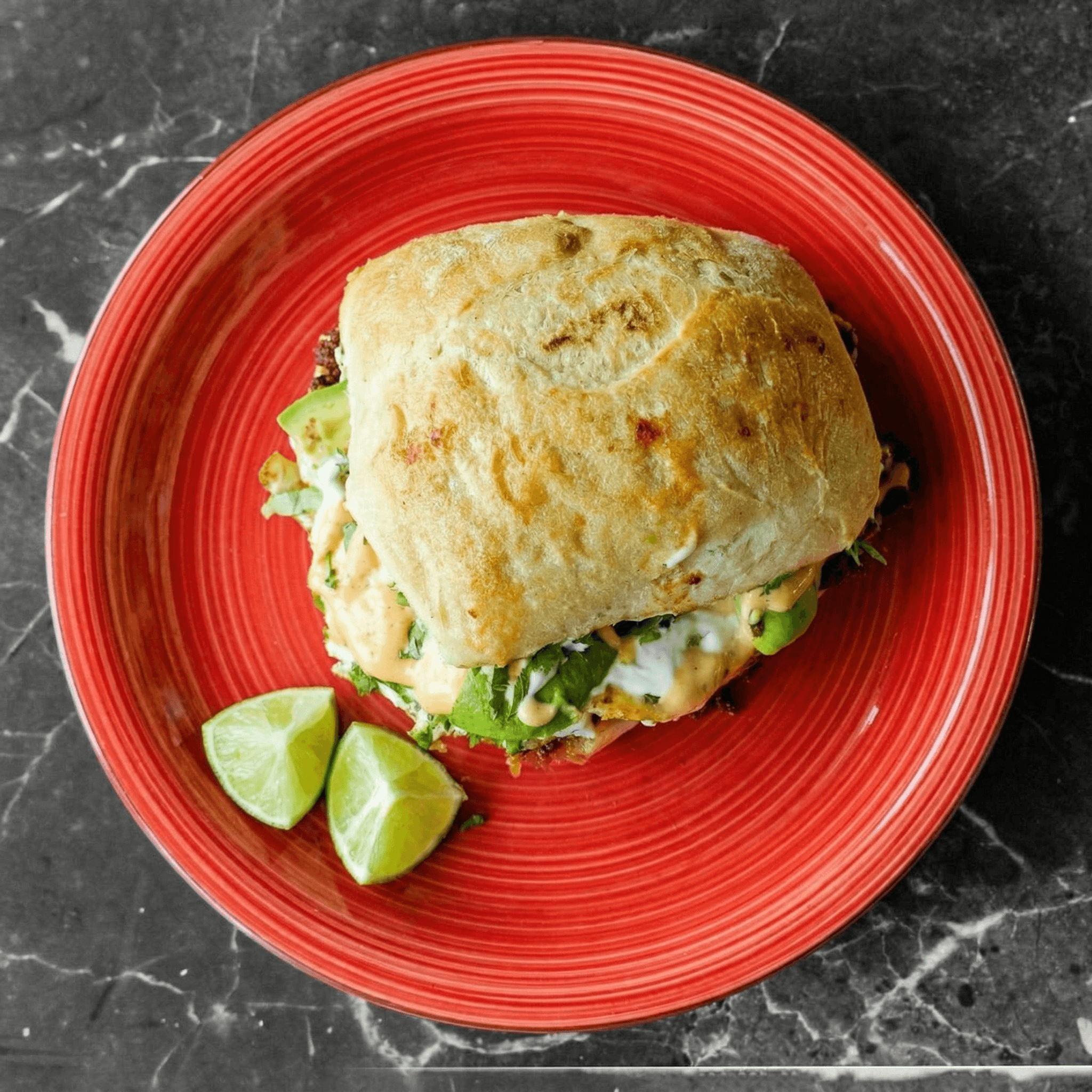 Protein of your choice, avocado, lettuce, tomato, cheese. Served with toasted telera roll and el fuego cilantro pesto and chipotle ranch sauce