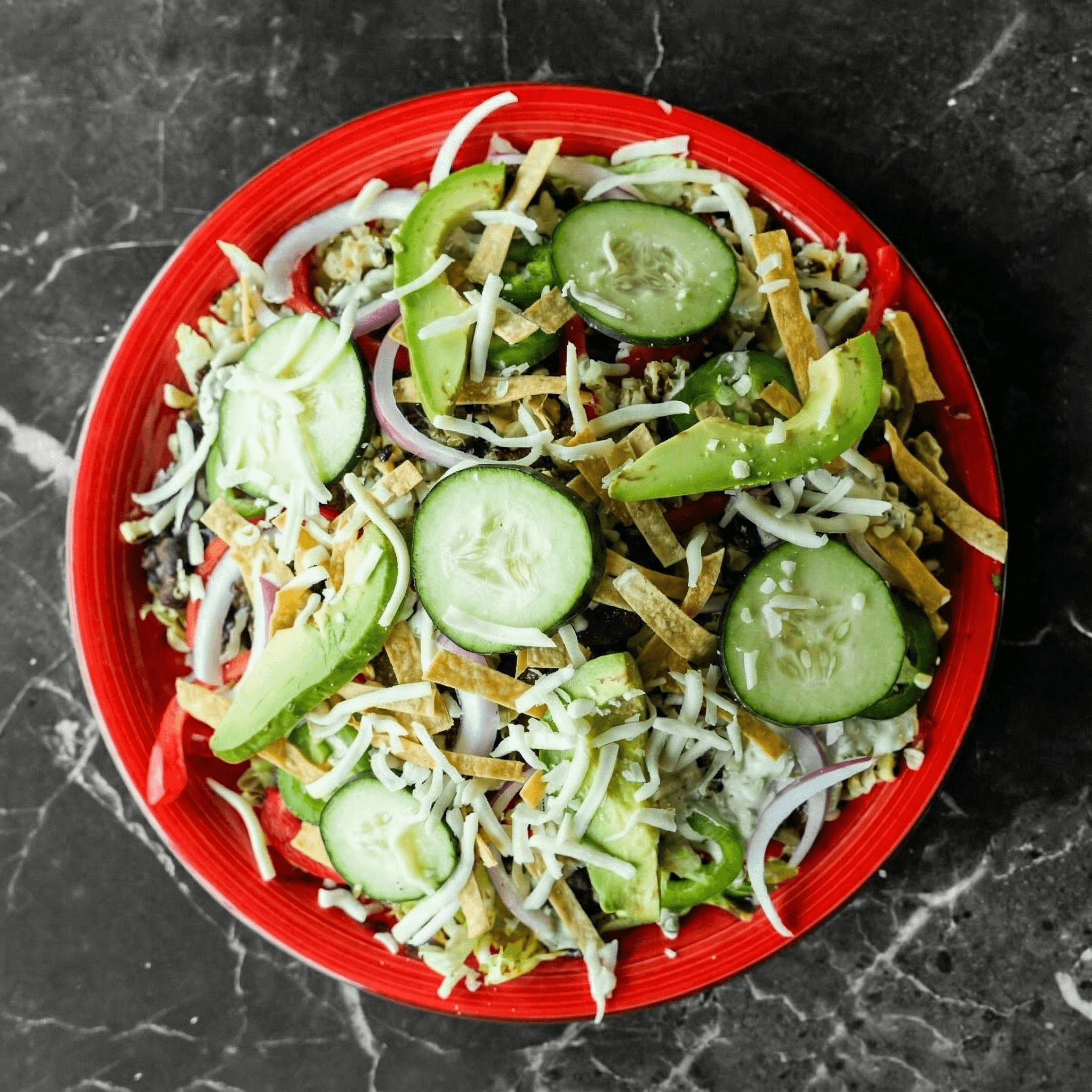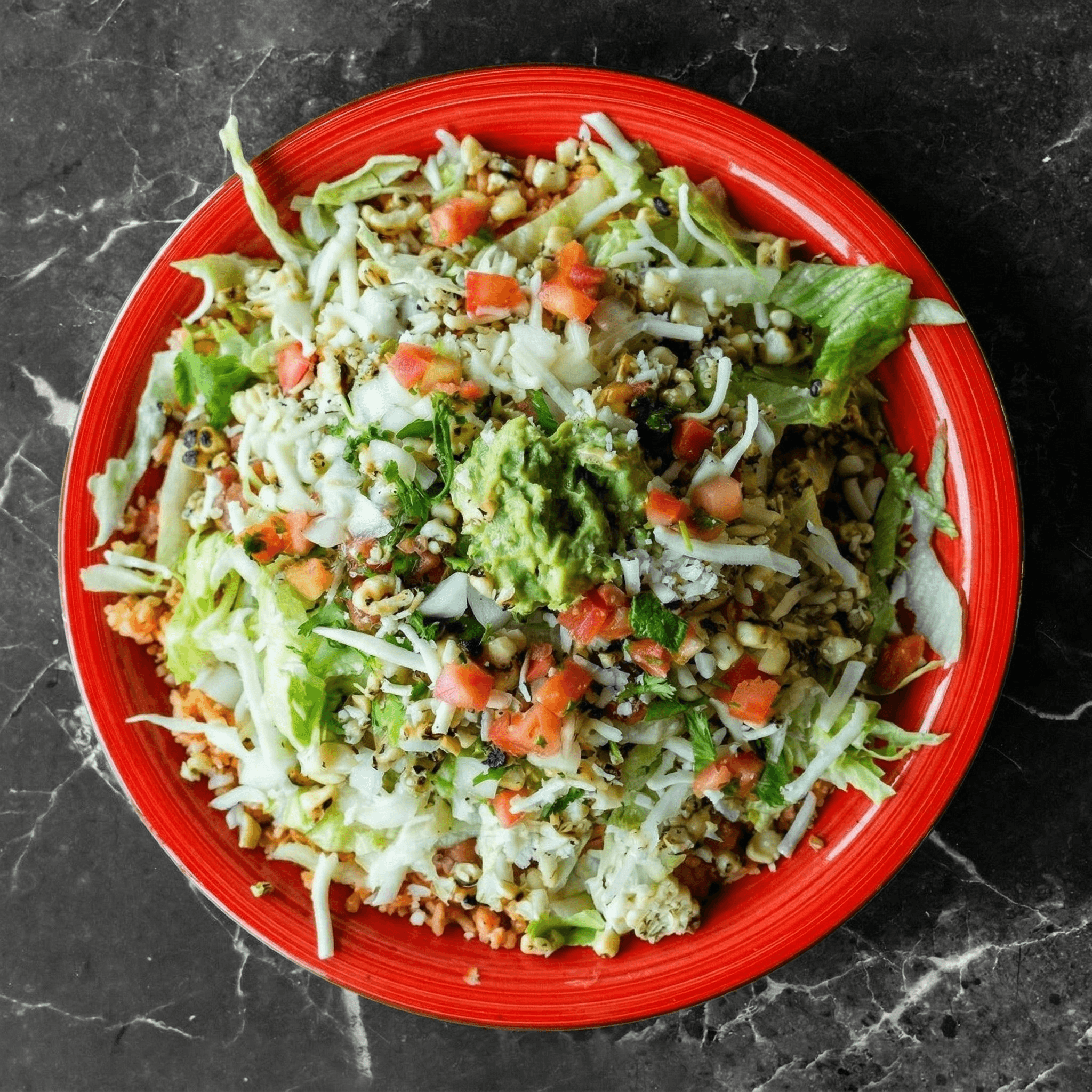 Choice of protein, grilled corn, lettuce, red bell pepper, tomatoes, cucumbers, red onion, avocado, black beans, Mexican cheese, jalapenos. Topped with tortilla strips and el fuego in house cilantro lime dressing