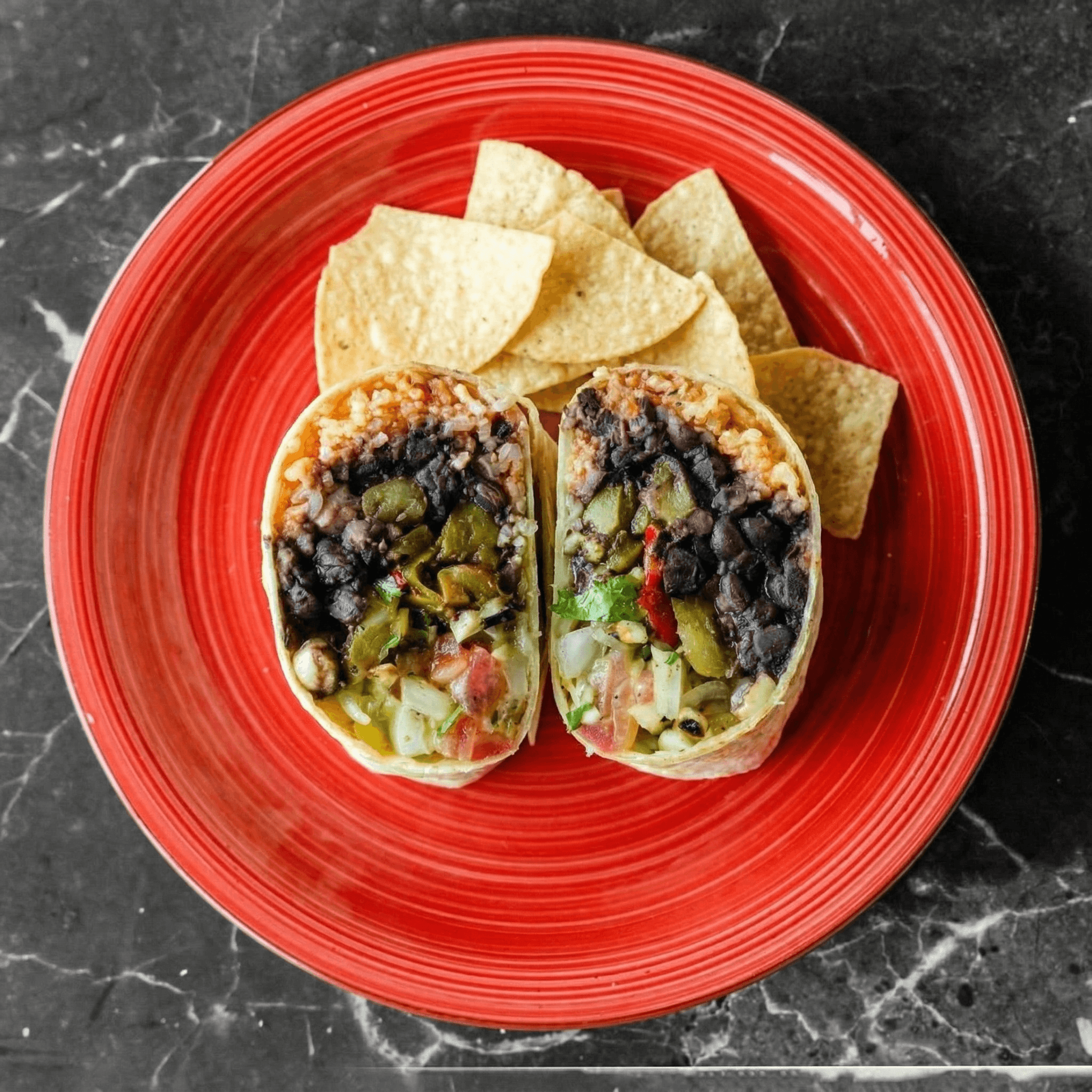 Grilled corn, grilled fajita onions, sauteed Mexican squash, mexican rice, choice of beans, onions, cilantro, tomato, in house avocado cilantro sauce