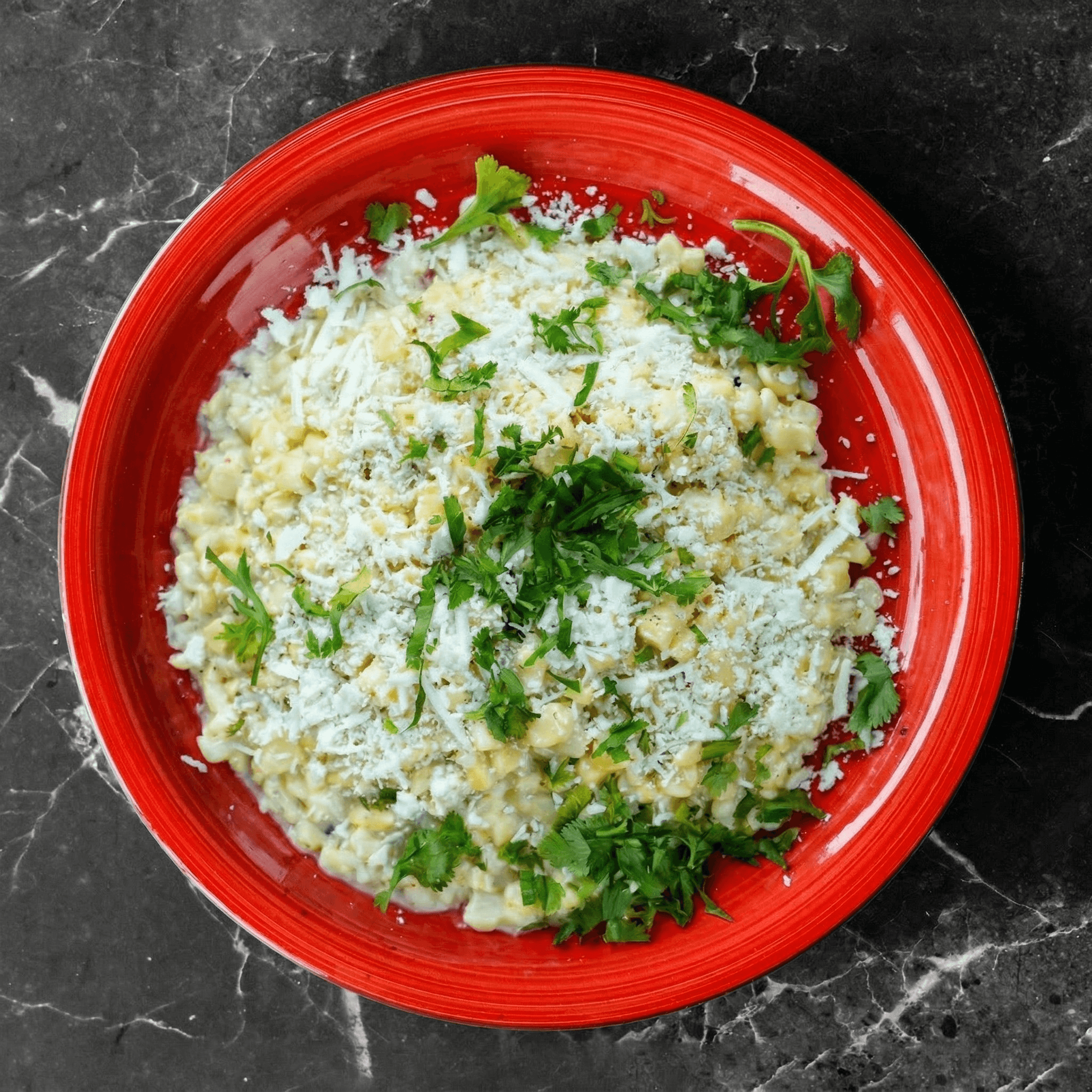 Refried pinto beans, chili lime corn, onions, and three blend cheese