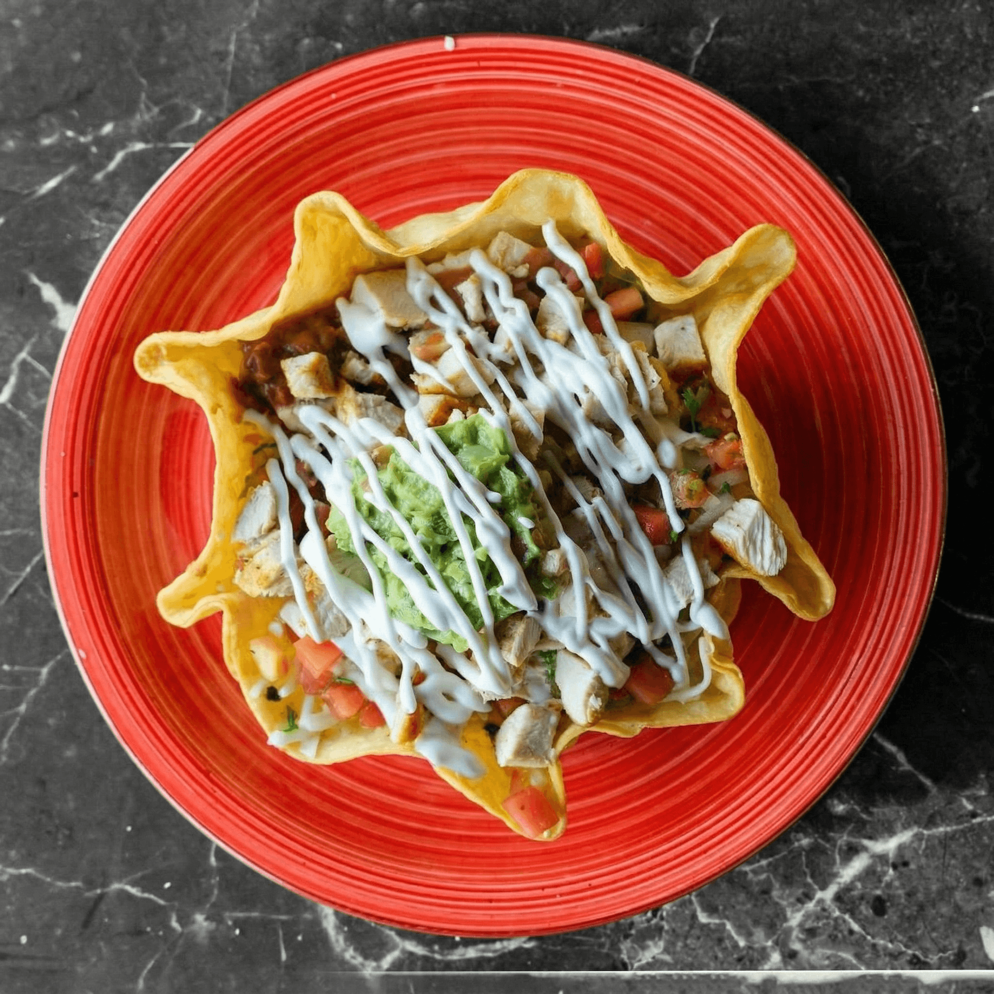 Choice of protein. Topped with lettuce, cheese, pico de gallo and sour cream